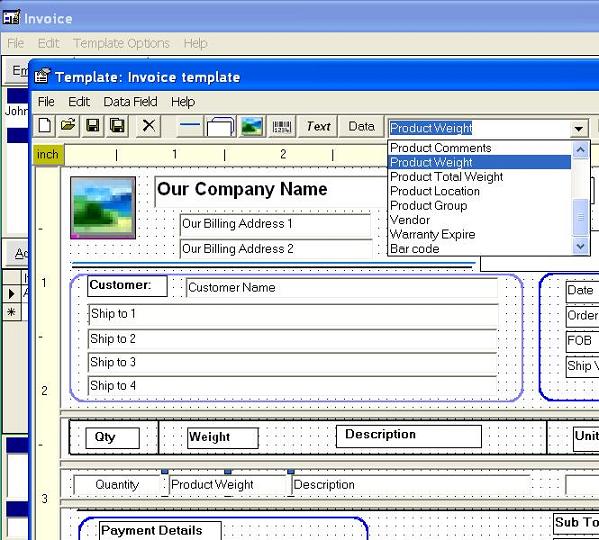 You can open the item list and select any product and enter weight of the item in the field "Weight". Open any invoice and click on the menu Template Options-Edit Print template. You'll see the Template editor. Click on the button "Data" and create a field using your mouse in the section "Detail". You have to select the name of the field "Product Weight" in the combobox on the toolbar. Similary, create the field "Product Total Weight" in the detail section and the field "Total weight" in the bottom section. Then you can save this template. Now you'll see the item weight,total item weight and total invoice weight in your custom invoice. System will calculate these values automatically.